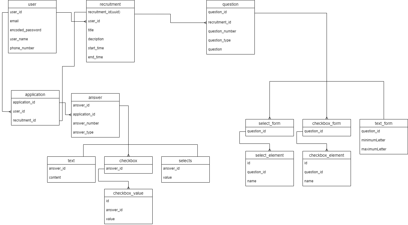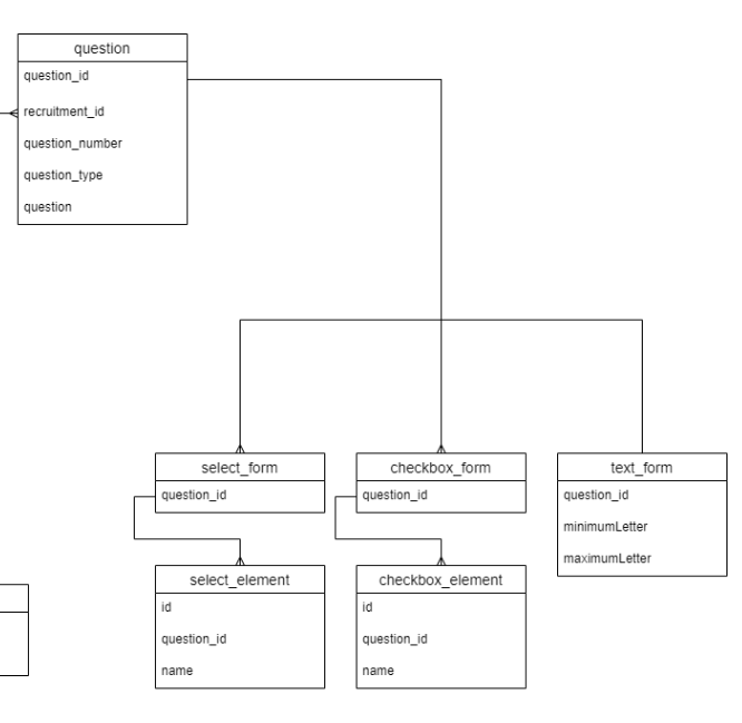 이 부분에서 text_form 테이블은 하나의 문항(question)에 대한 정보를 한 테이블로 관리할 수 있었지만, checkbox_form, select_form 과 같은 경우에는 여러개의 정해지지 않은 길이의 항목들이 필요했기 때문에 element 테이블을 생성하고 checkbox_form은 단순히 question_id 하나만 갖는다.