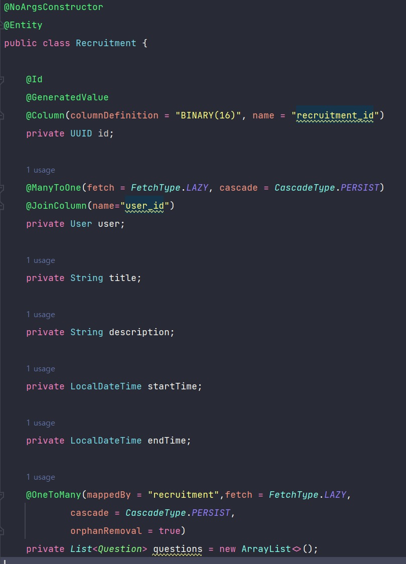 또 자연스럽게 머리속에 개념적으로 이어지는대로 user, recruitment, application 엔티티를 나누어 각각의 도메인 디렉터리에 저장하고 나머지 엔티티들은 패키지 안에서 의미적으로 연결된 연관관계에 따라 패키징했는데, 몇달전 공부했던 cascade, orphanRemoval 기능이 잘 생각나지 않아 찾아보던중 Aggregate Root라는 개념이 있었고 나도모르게 이 개념을 개발에 접목시켜서 개발하고 있었어서 신기했다. Aggregate Root는 한 도메인 내의 연관 객체에 묶음에서 가장 부모가 되는 엔티티를 말한다고 한다.(하단링크 참조)