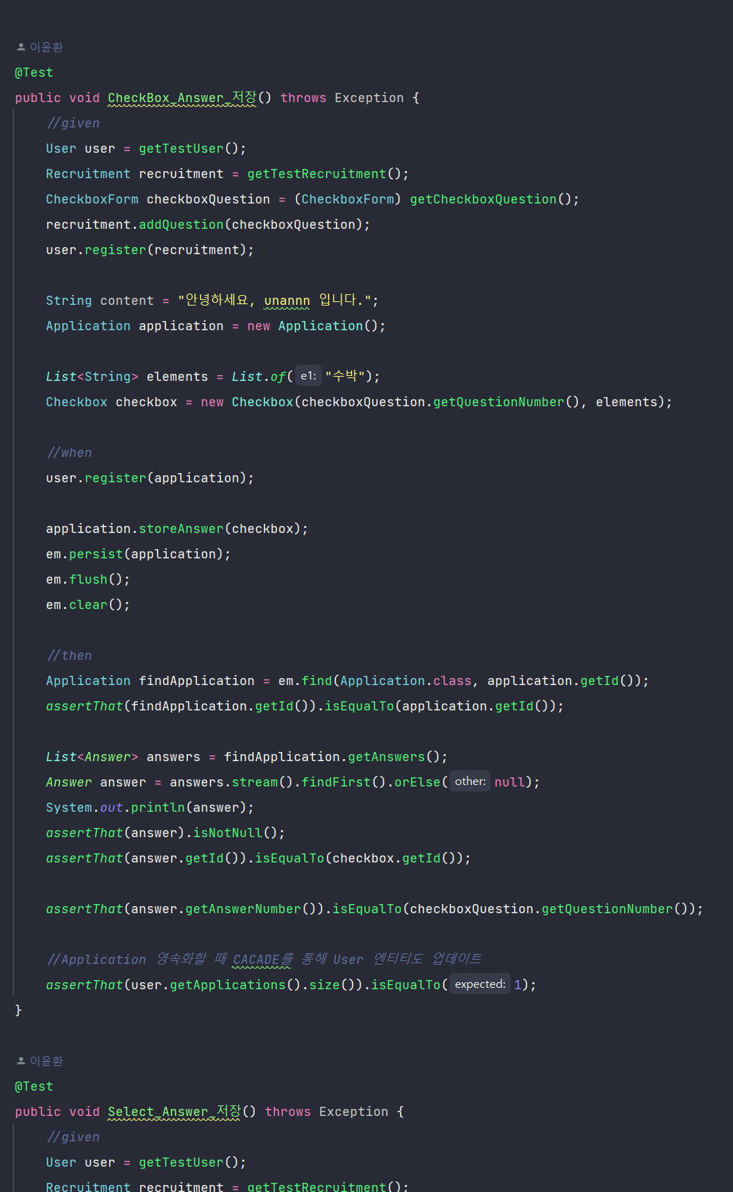 CascadeType을 ALL이 아니라 PERSIST로 한 건, 테스트 과정에서도 아직 persist 이외의 다른 동작이 필요한지 모르겠었어서이다. 나도모르게 CASCADE 기능을 사용하기보다 계속 개발을 진행하면서 나오는 상황에 '아 이럴 때 필요하구나'를 느끼고 싶어서 아직 PERSIST만 적용해 두었다.